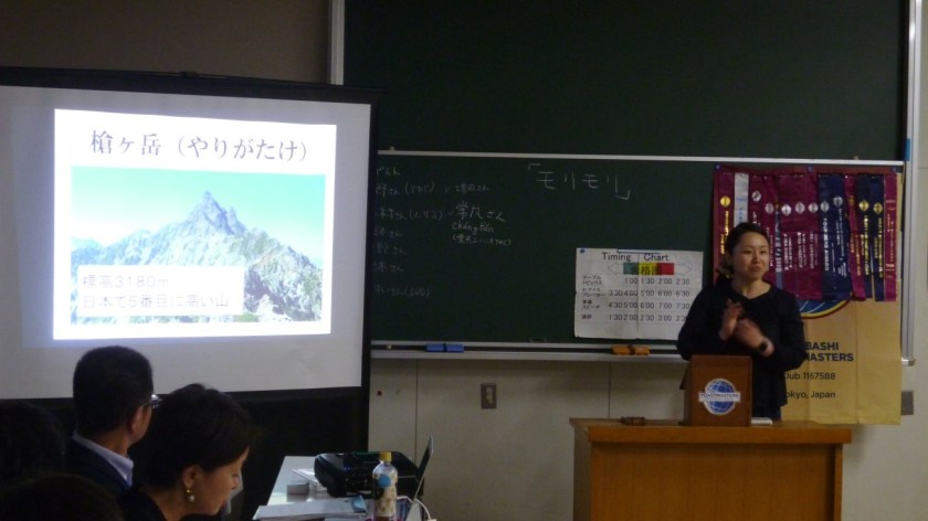 お次は準備スピーチ。準備スピーチ1はOさんによる「アルプス一万尺」。自分自身の登山経験をパワーポイントを華麗に操りながら鮮やかにスピーチしてくれました。