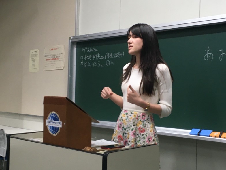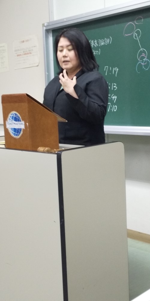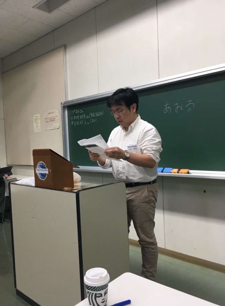 今夜のトーストマスターはT口さん。スピーカーや各役割を紹介する際に1人1人に対する想い(?)をユーモアたっぷりに伝えてくれて、いい場を提供してくれました!深謝です!
