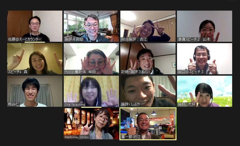 TMOE(司会)は、Sさんでした。流石の安定感、抜群な滑らかさ。役割の交代が多くてもスムースに調整されました。突然「今夜の言葉」を任された寺嶋千恵さんから「心温まる」役割紹介。時間を青・黄・赤のバッグで知らせる計時係・温井宣貴さん!え~と・文法係は拓郎会長でした。