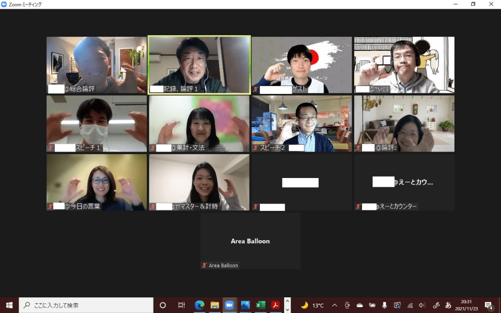 TMOEは関西在社でもリモート参加を続けてくれているTAさんです。関西弁が親しみやすくメンバーにも気配りしながらスタートしました。今夜の言葉はMOさんです。時の人、大谷翔平君を例に挙げて「輝いて」。使いやすいし響きがいいですね!今日の役割はダブルロールも多い中、皆さん協力して役をこなしていました。